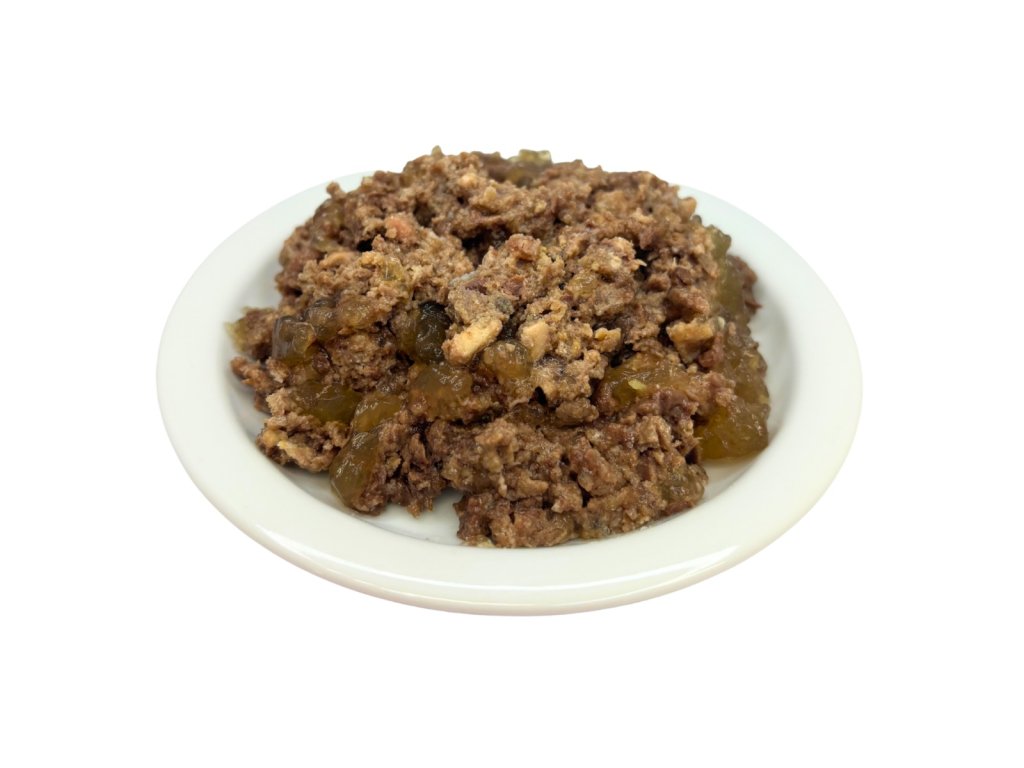 Zpracování masa i plnění konzerv se provádí ručně. Neobsahuje pšenici, kukuřici, sóju, umělá barviva a konzervanty, ochucovadla.