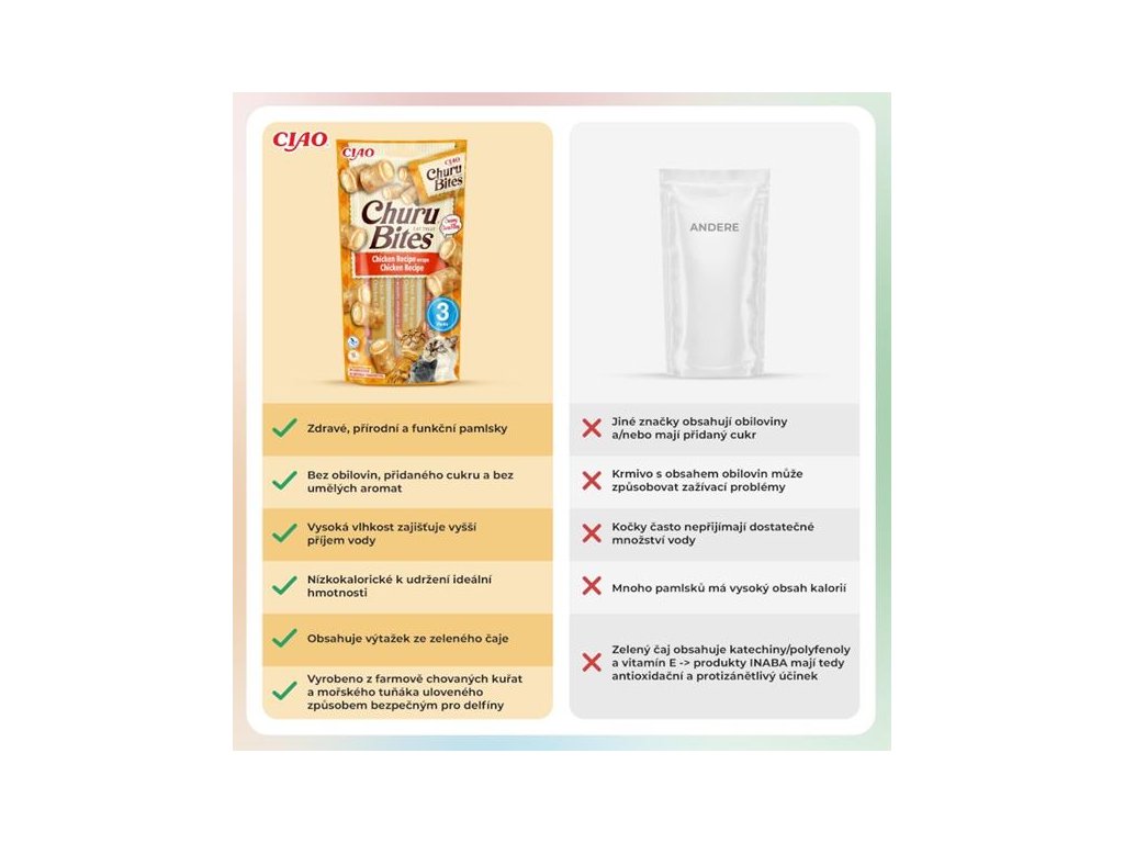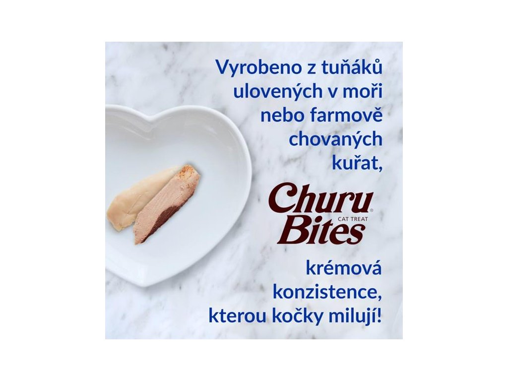 Churu Bites jsou šťavnaté, krémové a extra lahodné pamlsky ve tvaru polštářků s kuřetem z farmářského chovu plněné masovým pyré z divokého tuňáka. Inovativní měkká konzistence pamlsků vám umožní trávit společné chvíle s vaší kočkou hravým a interaktivním způsobem. Pamlsky jsou 100% přírodní, nízkokalorické, bez obilovin (grain-free), bez přidaných konzervantů a umělých barviv. Jsou také ideální pro ukrytí tablety na odčervení či jiného léku, který je potřeba kočce nenásilně podat.