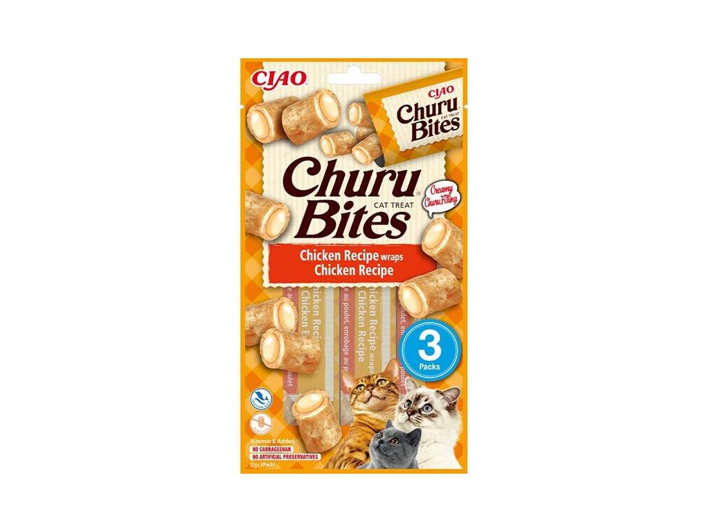 Churu Bites jsou šťavnaté, krémové a extra lahodné pamlsky ve tvaru polštářků s kuřetem z farmářského chovu plněné masovým pyré z kuřete. Inovativní měkká konzistence pamlsků vám umožní trávit společné chvíle s vaší kočkou hravým a interaktivním způsobem. Pamlsky jsou 100% přírodní, nízkokalorické, bez obilovin (grain-free), bez přidaných konzervantů a umělých barviv. Jsou také ideální pro ukrytí tablety na odčervení či jiného léku, který je potřeba kočce nenásilně podat.