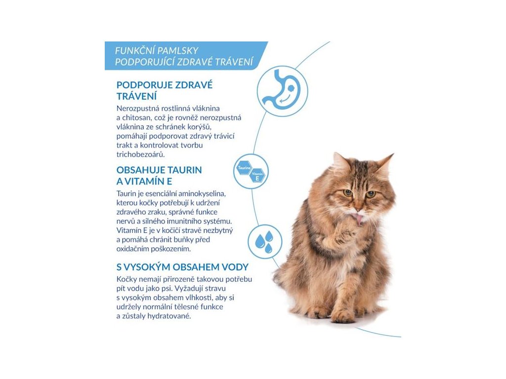 Kočky tráví 30–50 % bdělého času péčí o srst. Pomozte předejít vzniku trichobezoárů v jejich žaludku chutnou funkční lízací pastou Churu Hairball Control. Nerozpustná rostlinná vláknina a chitosan (nerozpustná vláknina ze schránek korýšů) pomáhají podpořit zdraví zažívacího traktu a kontrolovat tvorbu chlupových smotků. Pasta dále obsahuje taurin, který kočky potřebují k udržení zdravého zraku, správné funkce nervů a silného imunitního systému, a vitamín E, který pomáhá chránit buňky před oxidačním poškozením. Pamlsky mají vysoký obsah vody, čímž přispívají k hydrataci organismu a k prevenci potíží močového ústrojí. Jsou nízkokalorické, bez obilovin (grain-free), konzervačních látek a umělých barviv. Čerstvé maso kuřat chovaných na farmách poskytuje vysoce kvalitní bílkoviny.