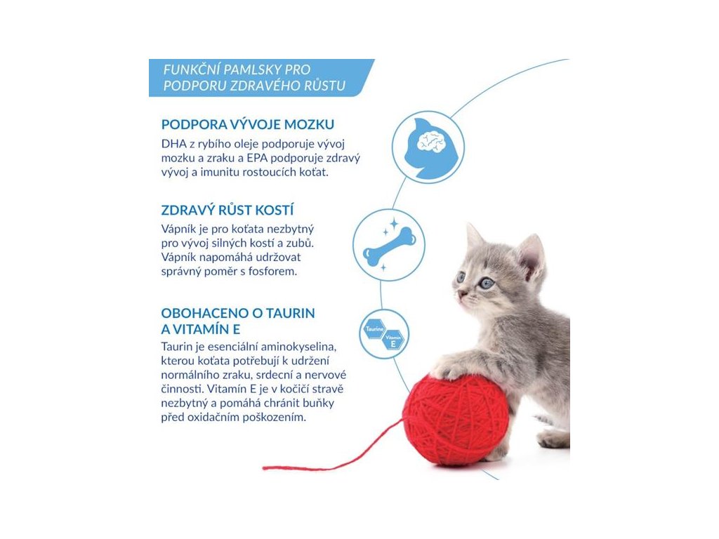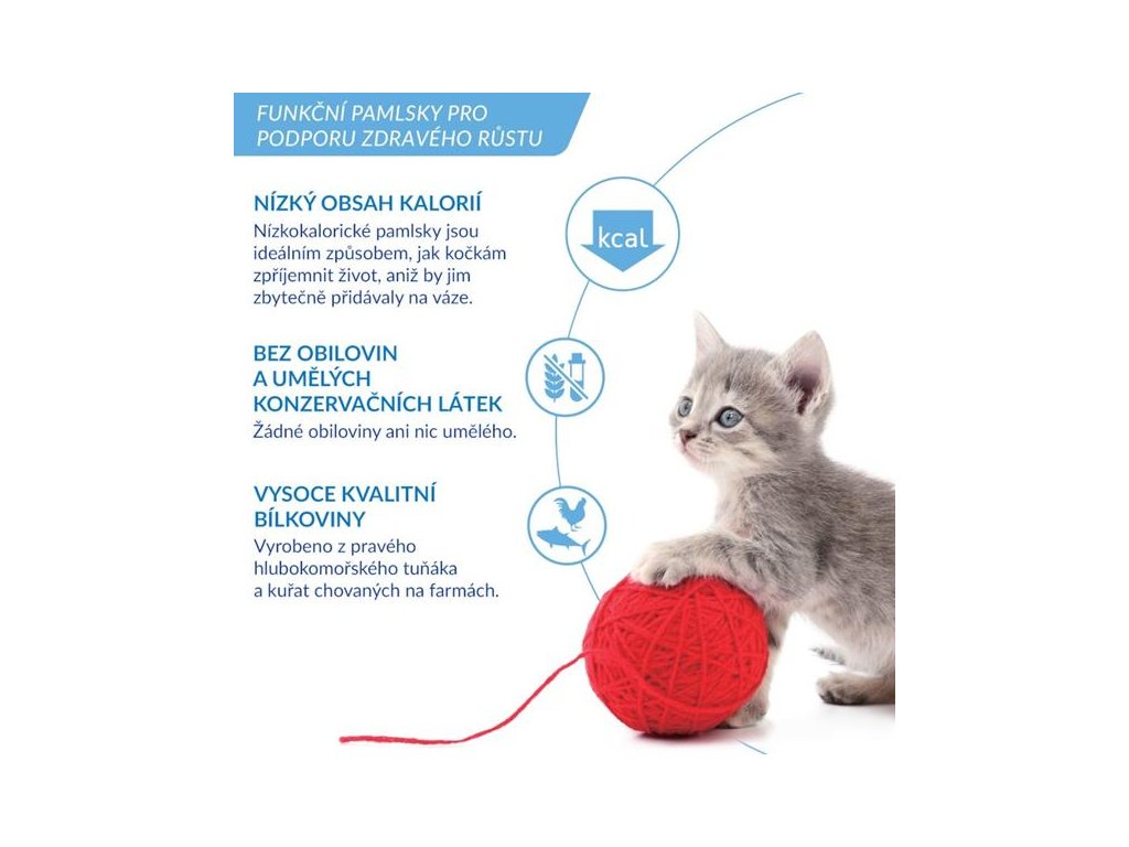 Dopřejte svému kotěti zdravý start do života a vytvořte si s ním silnější pouto díky funkčním pamlskům Churu Kitten. Lízací pasta obsahuje vápník nezbytný pro vývoj silných kostí a zubů. DHA z rybího oleje podporuje vývoj mozku a zraku a EPA podporuje zdravý vývoj a imunitu rostoucích koťat. Pamlsky jsou obohacené taurinem, který kočky potřebují k udržení zdravého zraku, správné funkce nervů a silného imunitního systému, a vitamínem E, který pomáhá chránit buňky před oxidačním poškozením. Díky vysokému obsahu vody přispívají pamlsky k hydrataci organismu a k prevenci potíží močového ústrojí. Jsou nízkokalorické, bez obilovin (grain-free), konzervačních látek a umělých barviv. Čerstvé maso kuřat chovaných na farmách poskytuje vysoce kvalitní bílkoviny.