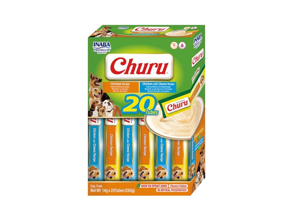 Masové pyré můžete podávat přímo z ruky, samostatně z misky nebo společně s granulemi pro vylepšení jejich chuti. Pamlsky Churu mají vysoký obsah vody a jsou díky tomu vhodným doplňkem k suchému krmivu, pro pohotovostní doplnění tekutin a pro psy, kteří málo pijí. Jsou také ideální pro ukrytí tablety na odčervení či jiného léku, který je potřeba psovi nenásilně podat.Balení obsahuje 10× kuřecí recepturu a 10× kuře se sýrem.