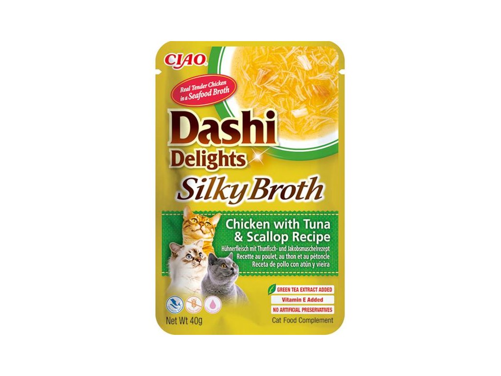 Kapsička obsahuje lahodný vývar z hřebenatky a tuňákových vloček doplněný o kousky kuřecího masa, tuňáka a hřebenatky. Daši je tradiční japonský rybí vývar z tuňákových vloček bonito známý svou výjimečně lahodnou chutí. Jeho zařazení do jídelníčku vaší kočky může dodat krmení nový rozměr a učinit z něj skutečný zážitek. Daši navíc poskytuje důležité živiny včetně vitamínů a minerálů a díky nízkému obsahu kalorií a tuku je zdravým doplňkem stravy. Je to produkt na bázi vývaru, obsahuje tedy vysoké množství vody, čímž přispívá k hydrataci organismu a k prevenci potíží močového ústrojí.