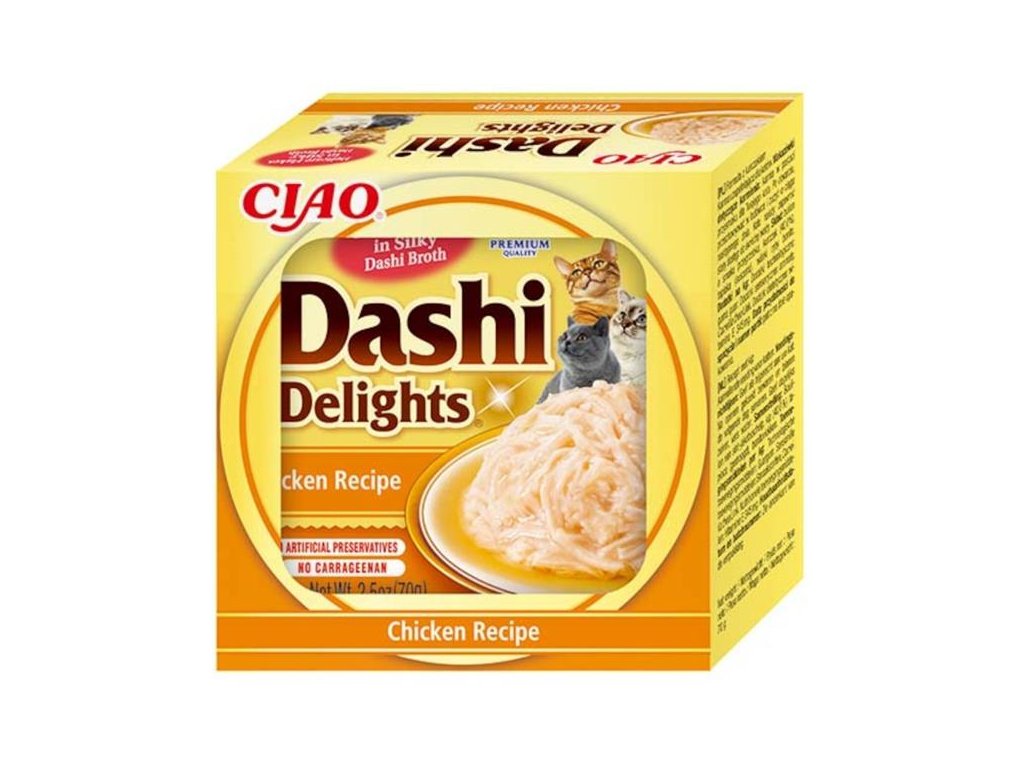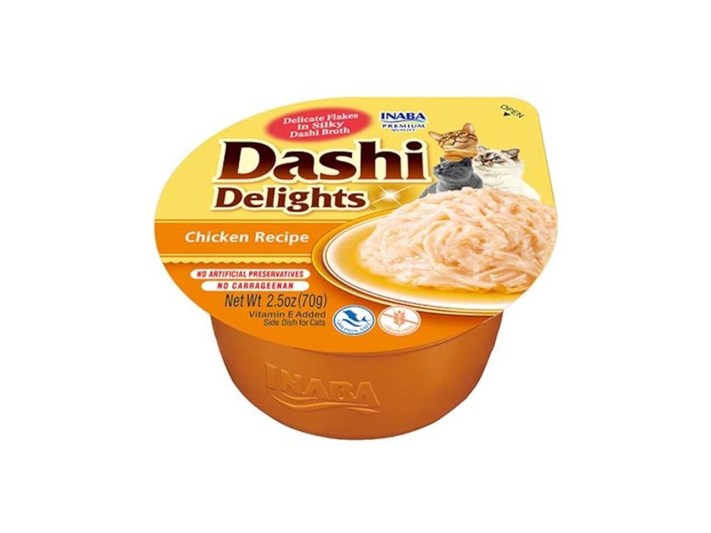 Kuřecí maso a jemné tuňákové vločky v lahodném vývaru. Daši je tradiční japonský rybí vývar z tuňákových vloček známý svou výjimečnou, lahodnou chutí. Jeho zařazení do jídelníčku vaší kočky může dodat krmení nový rozměr a učinit z něj skutečný zážitek. Nejde jen o chuť, daši poskytuje důležité živiny včetně vitamínů a minerálů a díky nízkému obsahu kalorií a tuku je zdravým doplňkem stravy. Je to produkt na bázi vývaru, obsahuje tedy vysoké množství vody, čímž přispívá k hydrataci organismu a k prevenci potíží močového ústrojí.Všechny produkty Inaba jsou bez obilovin (grain-free), zbytečných ingrediencí a pochybných přísad a jsou vyrobené z pravého mořského tuňáka a kuřat chovaných na farmách. Jsou hydratující, výživné a vždy lahodné.