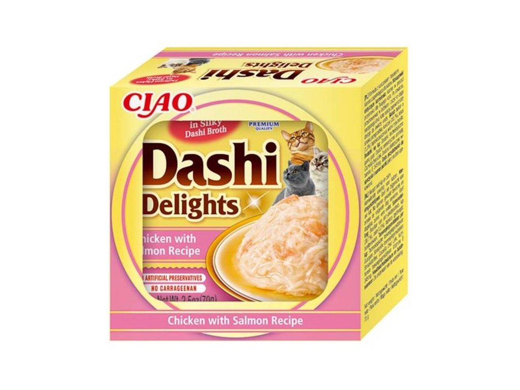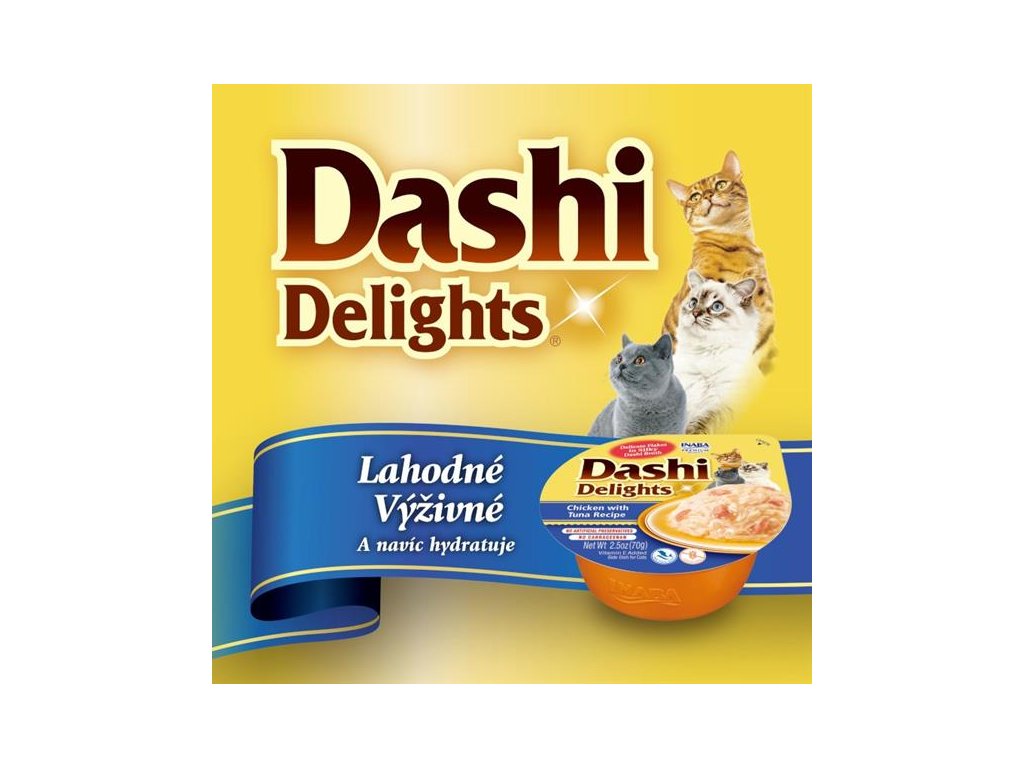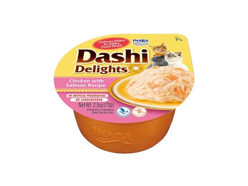Kuřecí maso, losos a jemné tuňákové vločky v lahodném vývaru. Daši je tradiční japonský rybí vývar z tuňákových vloček známý svou výjimečnou, lahodnou chutí. Jeho zařazení do jídelníčku vaší kočky může dodat krmení nový rozměr a učinit z něj skutečný zážitek. Nejde jen o chuť, daši poskytuje důležité živiny včetně vitamínů a minerálů a díky nízkému obsahu kalorií a tuku je zdravým doplňkem stravy. Je to produkt na bázi vývaru, obsahuje tedy vysoké množství vody, čímž přispívá k hydrataci organismu a k prevenci potíží močového ústrojí.Všechny produkty Inaba jsou bez obilovin (grain-free), zbytečných ingrediencí a pochybných přísad a jsou vyrobené z pravého mořského tuňáka a kuřat chovaných na farmách. Jsou hydratující, výživné a vždy lahodné.