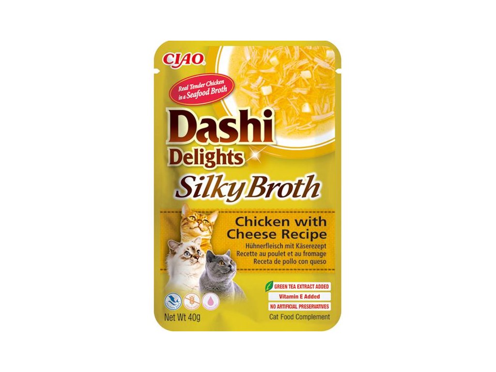 Kapsička obsahuje lahodný vývar z hřebenatky a tuňákových vloček doplněný o kousky kuřecího masa a sýra. Daši je tradiční japonský rybí vývar z tuňákových vloček bonito známý svou výjimečně lahodnou chutí. Jeho zařazení do jídelníčku vaší kočky může dodat krmení nový rozměr a učinit z něj skutečný zážitek. Daši navíc poskytuje důležité živiny včetně vitamínů a minerálů a díky nízkému obsahu kalorií a tuku je zdravým doplňkem stravy. Je to produkt na bázi vývaru, obsahuje tedy vysoké množství vody, čímž přispívá k hydrataci organismu a k prevenci potíží močového ústrojí.