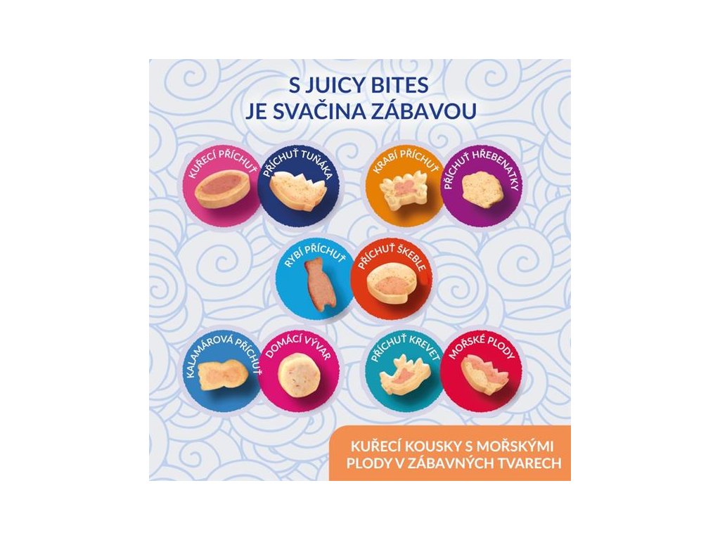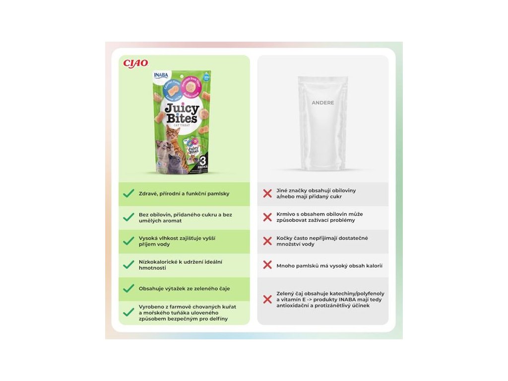 Pamlsky Inaba Juicy Bites ve dvou příchutích – ryba a škeble – jsou vláčné, měkké, přirozeně chutné a hlavně zdravé. Vyrobeny jsou z pravého tuňáka a kuřat chovaných na farmách, mají nízký obsah kalorií a neobsahují obiloviny, konzervanty ani umělá barviva. Pro kočky mají ideální velikost a pro radost všech zúčastněných zábavné tvary.