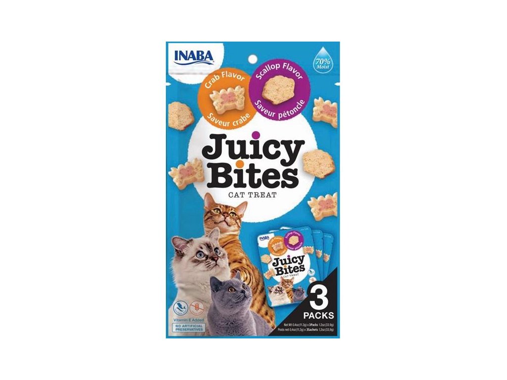 Pamlsky Inaba Juicy Bites ve dvou příchutích – krab a hřebenatka – jsou vláčné, měkké, přirozeně chutné a hlavně zdravé. Vyrobeny jsou z pravého tuňáka a kuřat chovaných na farmách, mají nízký obsah kalorií a neobsahují obiloviny, konzervanty ani umělá barviva. Pro kočky mají ideální velikost a pro radost všech zúčastněných zábavné tvary.