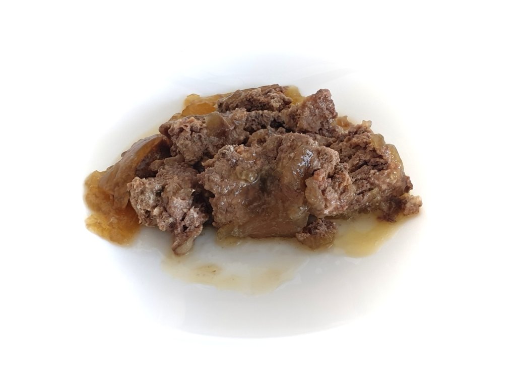 Složení: hovězí 70 % (maso, játra, srdce, plíce, vemeno, bachor), vepřové 20 % (játra, srdce, plíce), drůbeží maso 10 %.