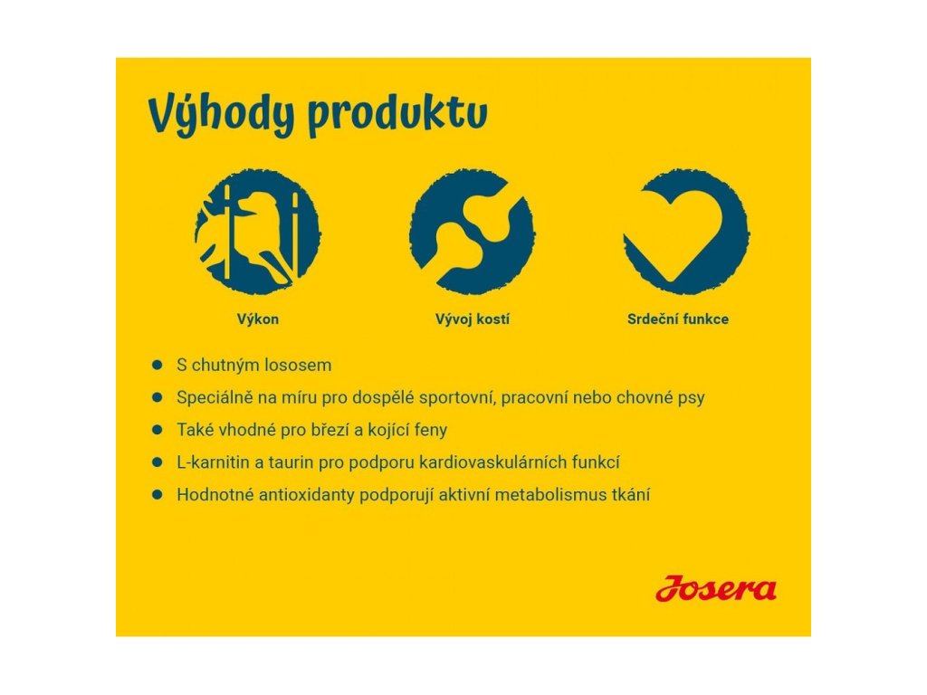 Vysoký obsah energie: vysoce kvalitní receptura Josera High Energy splňuje stravovací potřeby psů, kteří jsou vystaveni větší zátěži. Mezi ty patří sportovní psi, stejně jako chovní, pracovní a také březí nebo kojící feny. Obsažený L-karnitin se postará o látkovou výměnu tuků a tím pomáhá rychle dodat energii v případě potřeby. V kombinaci s taurinem podporuje zdravou srdeční funkci.