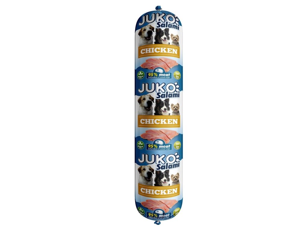 JUKO Salami Chicken je ideální pro psy všech věkových kategorií. Vhodné jako kompletní krmivo či jako doplněk ke granulím.