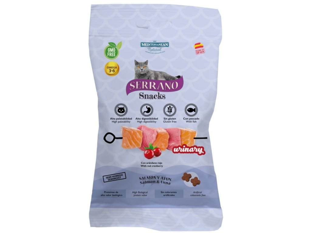 Hypoalergenní pamlsek Serrano snacks cat urinary salmon & tuna obsahující brusinky, které pomáhají předcházet zánětu a podporují zdraví močových cest.