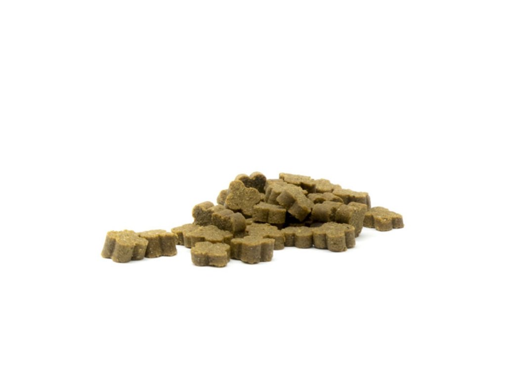 Ve tvaru malých kousků vyrobených z masa vařených při nízké teplotě, poskytující všechny živiny.