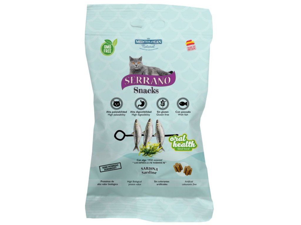 Hypoalergenní pamlsek Serrano snacks cat oral care pomáhá pečovat o celkovou ústní dutinu koček. Obsahuje mořskou řasu, kdy dlouhodobým užíváním lze narušit již stávající zubní kámen, který časem zmizí nebo ho lze snadno kartáčkem odstranit.