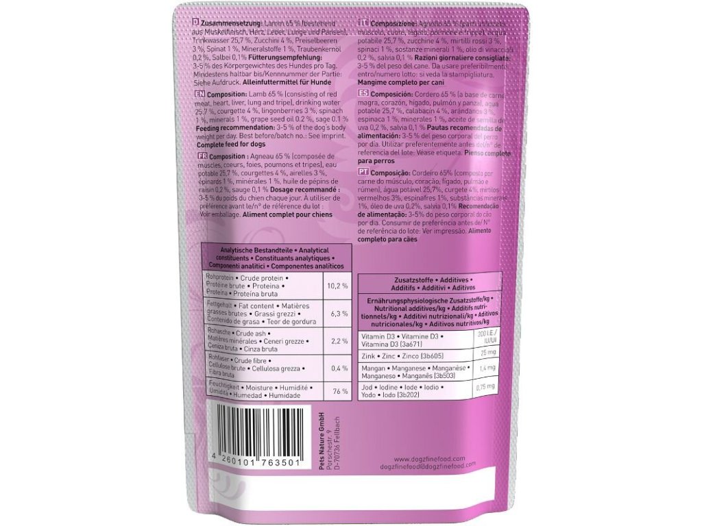 Lahodné krmivo pro psy, které obsahuje vysoký podíl jehněčího masa, zdravé brusinky, cuketu, šalvěj a špenát. Dogz finefood obsahuje pouze suroviny vysoké potravinářské kvality a svým složením odpovídá přirozené psí stravě. Krmivo je bez konzervantů, umělých barviv a dochucovadel. Krmivo neobsahuje geneticky upravené suroviny. Jedná se o kompletní krmivo.