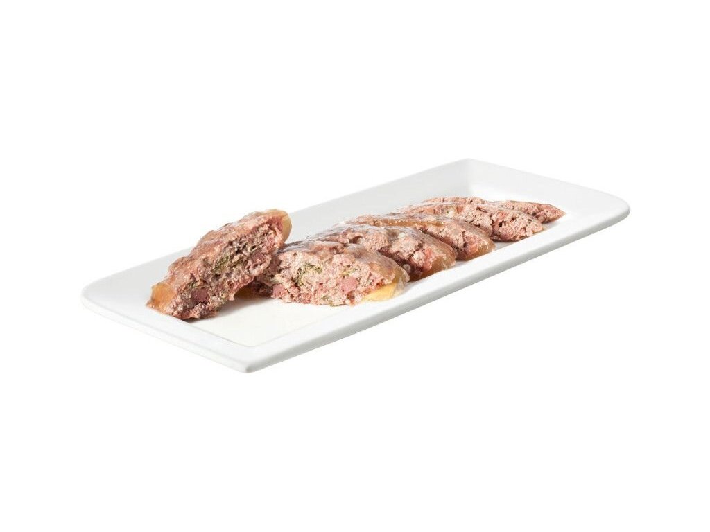 Složení: jehněčí maso 65% (svalovina, srdce, játra, plíce a dršťky), pitná voda 25,7%, cuketa 4%, brusinky 3%, špenát 1%, minerály 1%, hroznový olej 0,2%, šalvěj 0,1%.