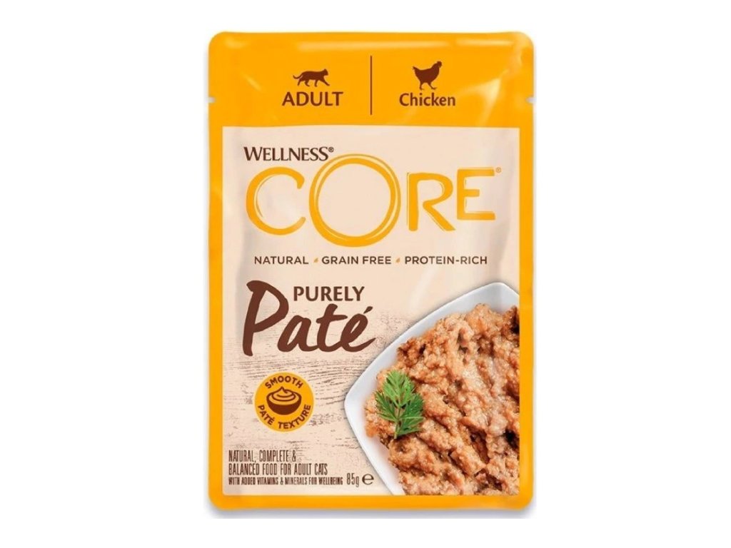 Kuřecí paštika Wellness Core Purely Pate v jemné konzistenci si zamilují všechny kočky. Po chuti plné bílkovin zatouží i ty nejvybíravější kočičí šelmy. Díky vysokému obsahu bílkovin podporují silné svaly, imunitu a pohyblivost, proto udrží vaši kočku v dobré kondici a štíhlé linii. Pro podporu jejich citlivého bříška je paštika bezobilná a přirozeně hypo-alergenní, tudíž neobsahuje sóju, mléčné výrobky, umělá barviva, aromata ani konzervační látky. Lahodnou texturou paštika přiláká i mlsné kočičí jazýčky. Zvyšuje příjem vody pro podporu každodenní hydratace. Obohacená o vitaminy a minerální látky pro zdraví kočky.
