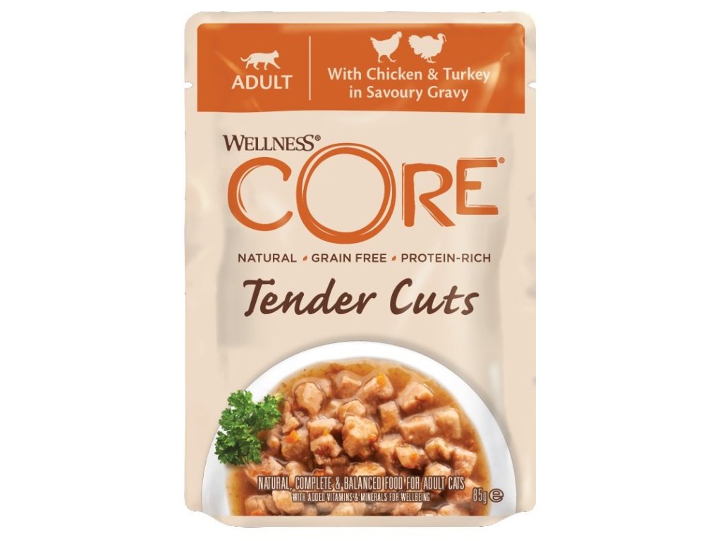 Wellness CORE Tender Cuts je přírodní mokré krmivo určené pro dospělé kočky. V krmivu Wellness CORE Tender Cuts with Chicken & Turkey in Savoury Gravy najdete voňavé, jemné a chutné masové kousky z kuřete a krocana v lahodné omáčce, které si zamiluje i opravdový kočičí gurmán. Jako všechny Wellness CORE receptury, Tender Cuts jsou bez obilovin, pšenice, kukuřice, sóji, mléčných výrobků, umělých barviv, aromat a konzervačních látek. Snadné otevíraní a ideální velikost kapsičky umožňuje snadné krmení bez zbytečného nepořádku.