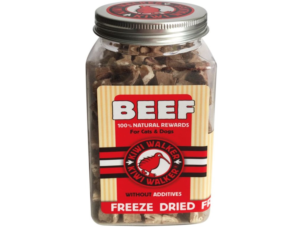 Mrazem sušené hovězí maso Kiwi Walker je 100% přírodní pochoutka z malých kousků opravdového masa.