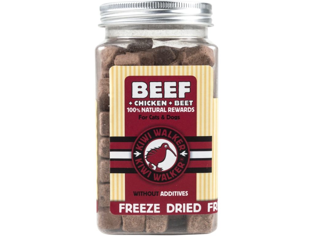Mrazem sušené hovězí s kuřecím a řepou Kiwi Walker je 100% přírodní pochoutka z malých kousků opravdového masa a zeleniny.
