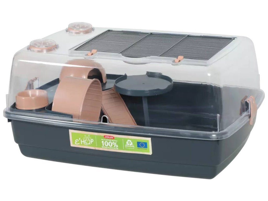 Nová řada ekologických klecí pro křečka. Dno je vyrobené ze 100% recyklovaného plastu.Průhledné stěny poskytují zvířeti optimální výhled a brání vypadávání podestýlky z klece