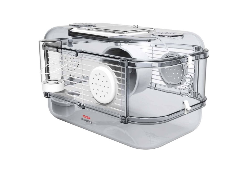 Nová řada klecí RODY 3 pro malé hlodavce v novém designu s inovovaným dnem a horním okrajem. Klece jsou vyrobeny z transparentního plastu v lehkém šedém tónování a jejich součástí je bohaté příslušenství ve 4 trendy barvách (bílá, modrá, žlutá, červená). Klec RODY 3 Mini má jednu úroveň a je vhodná jako přídavný obytný prostor nebo jako cestovní klec. Příslušenství: 1 kolotoč, 1 napáječka, 1 miska, 2 krytky otvorů Klece nabízejí dostatečný obývací a hrací prostor pro domácí mazlíčky, který lze pomocí otvorů připojit na další klece (další komponenty je třeba dokoupit). Díky transparentnímu provedení klece je možné mazlíčky při všech činnostech sledovat. Rozteč drátů mřížky: 1cm Vnější rozměr: 330 x 210 x 180 mm Vnitřní rozměr: 320 x 215 x 130 mm
