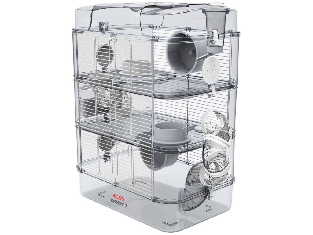 Nová řada klecí RODY 3 pro malé hlodavce v novém designu s inovovaným dnem a horním okrajem. Klece jsou vyrobeny z transparentního plastu v lehkém šedém tónování a jejich součástí je bohaté příslušenství ve 4 trendy barvách (bílá, modrá, žlutá, červená). Klec RODY 3 Trio má 3 úrovně a příslušenství: 2x kolotoč, 1 napáječka, 2x miska, 1 domeček, 7 dílů pro sestavení tunelu, 4 krytky otvorů Klece nabízejí dostatečný obývací a hrací prostor pro domácí mazlíčky, který lze pomocí otvorů připojit na další klece (další komponenty je třeba dokoupit). Díky transparentnímu provedení klece je možné mazlíčky při všech činnostech sledovat. Rozteč drátů mřížky: 1cm Rozměr: 410x270x530 cm