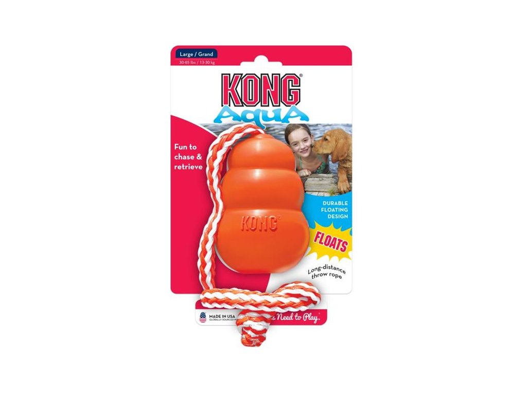 Kong Aqua s praktickým poutkem, plovoucí hračka k aportování z přírodního kaučuku, ve výrazné oranžové barvě. Díky přírodnímu kaučuku, ze kterého je vyrobena, velmi odolná proti rozkousání. Kong Aqua skáče díky svému tvaru naprosto nepředvídatelně. Hračka plave na vodě a je upevněná na provaze, což ji umožňuje velmi daleko hodit. Je to perfektní hračka pro nácvik aportování nebo pro vyřádění se v jakémkoli terénu. Svítivě oranžová barva umožňuje tuto hračku najít i v křoví či v lese.