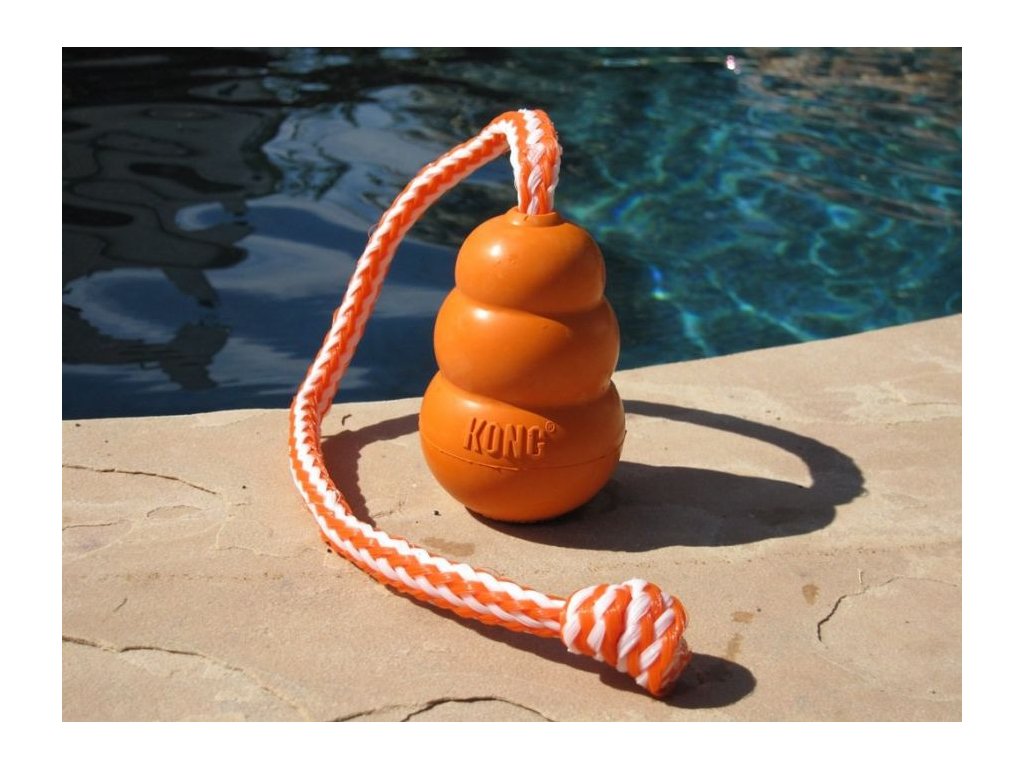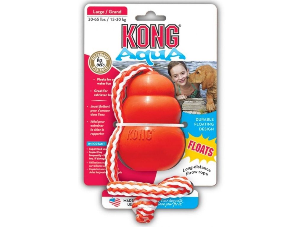 Kong Aqua s praktickým poutkem, plovoucí hračka k aportování z přírodního kaučuku, ve výrazné oranžové barvě. Díky přírodnímu kaučuku, ze kterého je vyrobena, velmi odolná proti rozkousání. Kong Aqua skáče díky svému tvaru naprosto nepředvídatelně. Hračka plave na vodě a je upevněná na provaze, což ji umožňuje velmi daleko hodit. Je to perfektní hračka pro nácvik aportování nebo pro vyřádění se v jakémkoli terénu. Svítivě oranžová barva umožňuje tuto hračku najít i v křoví či v lese.