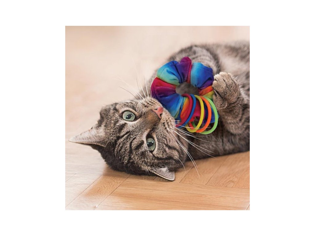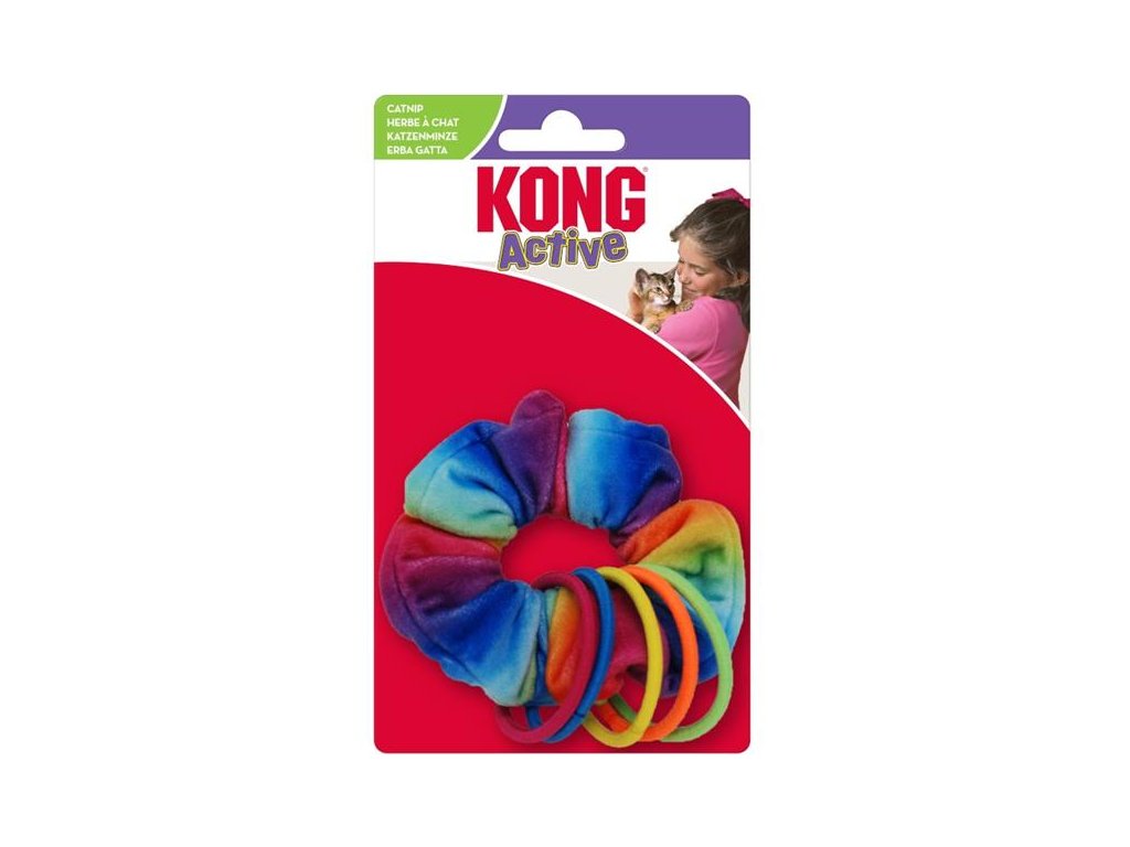 Hraje si vaše kočka ráda s gumičkami do vlasů? Nabídněte jí neodolatelnou kombinaci! KONG Active Scrunchie je řasená gumička z duhového plyše, na kterou je navlečených pět dalších, menších gumiček. Pro větší vzrušení ze hry je hračka naplněná prémiovým severoamerickým catnipem (šantou kočičí), má vnitřní šustivou vrstvu a skrytou rolničku.