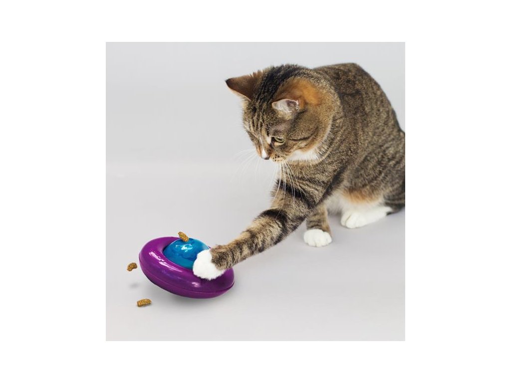 Naplňte interaktivní hračku KONG Cat Gyro granulemi či pamlsky a sledujte kočku, jak se z ní bude snažit dostat dobroty ven. Jak zvíře hračkou pohybuje, středová koule s otvory se otáčí a náplň z ní postupně vypadává. Středovou kouli lze vyjmout a rozšroubovat, takže se snadno plní i čistí. S objemem cca 80 ml pojme přibližně půl denní dávky krmiva – je tedy ideální náhradou za misku. Pro ještě větší vzrušení ze hry je hračka navíc napuštěná šantovým olejem KONG North American Premium Catnip a ve vnějším prstenci má zabudovanou rolničku.