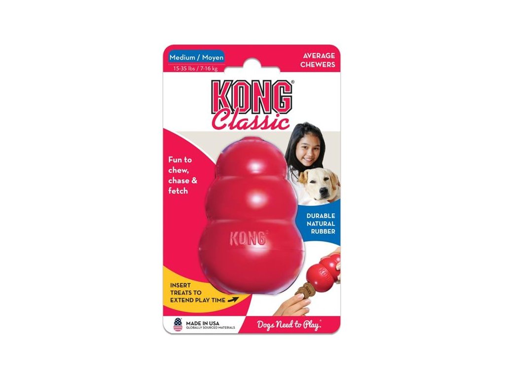 Hračka KONG je interaktivní plnitelná hračka pro psy ze speciální odolné gumy. Je vyrobena z ultra elastického, čistě přírodního kaučuku, který je velmi pružný a zároveň velmi odolný a pevný i pro největší ničitele hraček. Speciální tvar zajišťuje při dopadu nepravidelný odraz. Hračku lze naplnit pamlsky nebo pastou a zvýšit tak zájem psa o hračku.