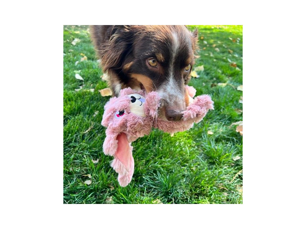 Měkký plyšový králík z řady Scrumplez zaujme „rozcuchanou“ huňatou srstí a velkýma plandavýma ušima, která jsou volně provléknutá hlavou hračky. Tahání za ně je o to zábavnější, že v sobě skrývají pískátka. Hračka je díky tomu vhodná nejen pro mazlení, ale i pro aportování, mírné přetahování a jemné kousání.