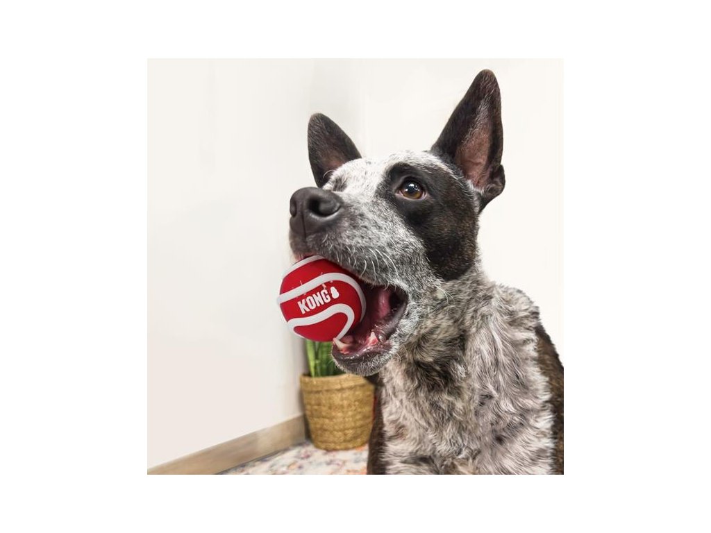 Míčky KONG Signature Ball vynikají odolností a vysokým odskokem díky speciální gumě, z níž jsou vyrobeny. Pružný, a přitom houževnatý materiál dobře odolává psím zubům. Zároveň je k zubům a dásním velmi šetrný – stejně jako jemná tenisová plsť, kterou KONG používá. Pro ještě větší vzrušení ze hry mají v sobě některé míčky zabudované pískátko.