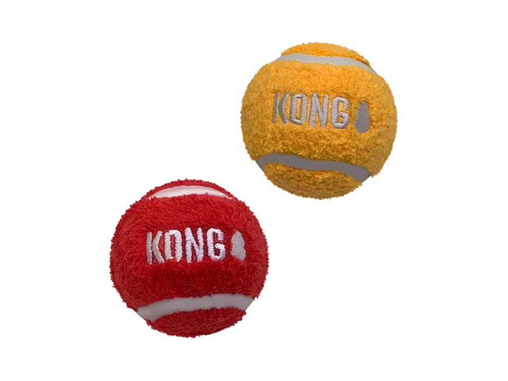 Sada dvou míčků KONG Sport Softies je ideální volbou pro psy, kteří milují aportování. Míčky kombinují odolné gumové jádro s hebkým flísovým povrchem, který je k psím zubům a dásním šetrnější než povrch běžných tenisových míčků. Neobsahují pískátko a mají výrazné barvy, abyste je vy i váš pes snadno našli. Perfektní pro domácí i venkovní hraní!