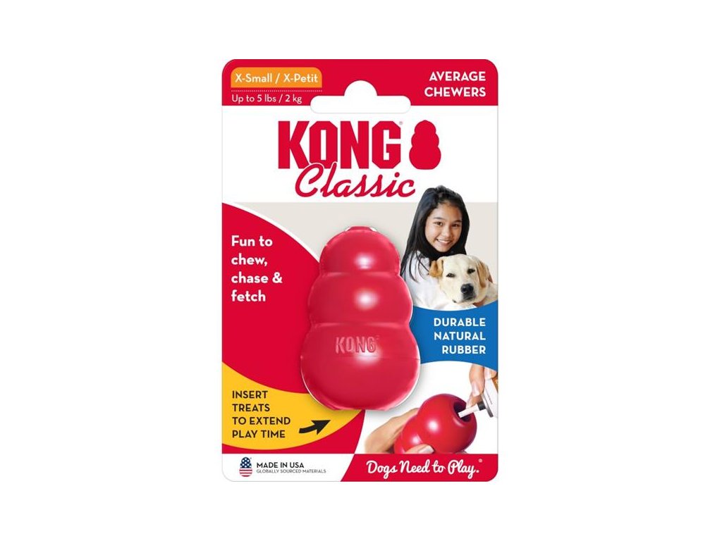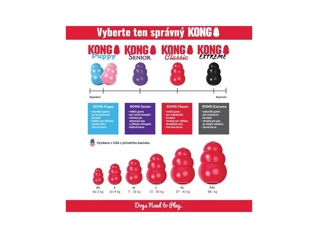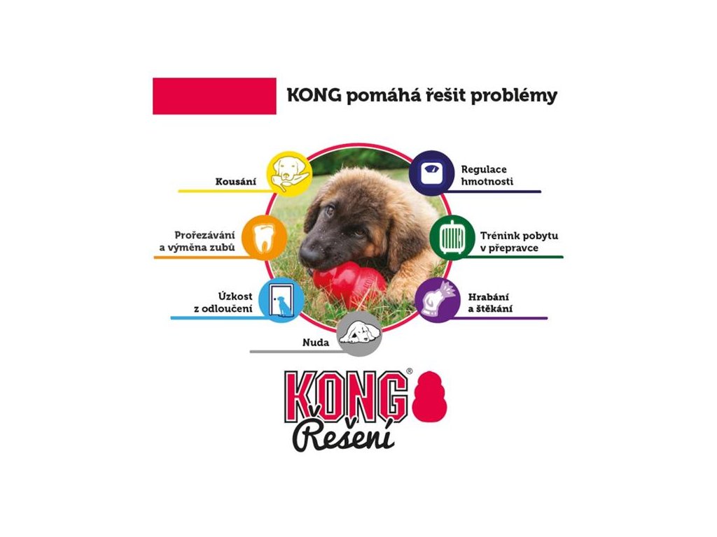KONG Classic = už přes 30 let zlatý standard psích hraček. Hračka KONG Classic je interaktivní plnitelná hračka vyrobená z čistě přírodního kaučuku, který je mimořádně pružný a zároveň pevný, vhodný i pro největší ničitele hraček. Při aportování představuje pro psy vzrušující výzvu díky speciálnímu tvaru (připomínajícímu sněhuláka), který zajišťuje při dopadu nepředvídatelný odskok. Zájem psa o hračku můžete ještě zvýšit, když ji naplníte krmivem nebo pamlsky.KONG je účinný výcvikový prostředek, který řeší řadu problémů: nudu, kousání bot, kabelů, nábytku apod., bolest z prořezávání zubů a přezubování, strach z odloučení nebo z nového prostředí (byt, ubikace, hotel), přivykání pobytu v přepravce apod.