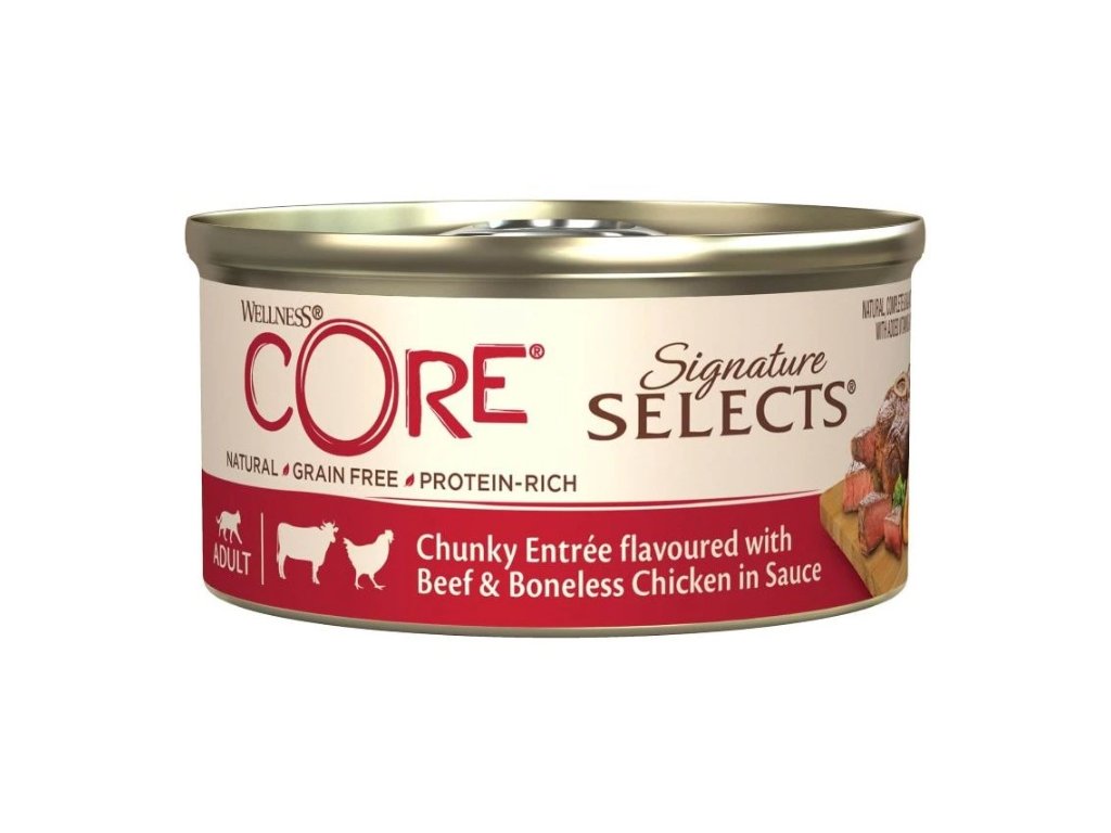 Konzerva Wellness Core Cat Selects Chunky kuře s hovězím v omáčce 79g