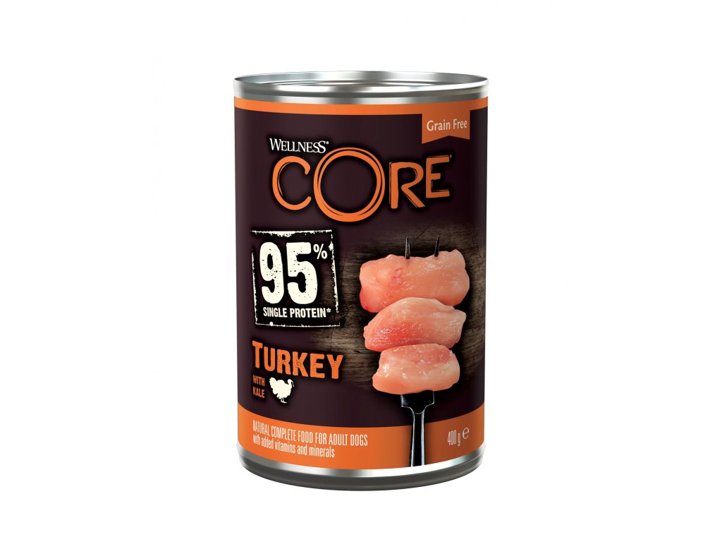 Wellness CORE 95 % je kompletní krmivo s krůtím masem v jediné konzervě vhodné pro dospělé psy. Neobsahuje obiloviny a je bohaté na vitamíny, minerální látky a proteiny. Nabitá konzerva plná přírodních ingrediencí potěší i ty největší psí gurmány.