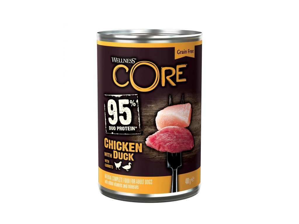 Konzerva Wellness Core Dog 95% Protein Adult kuře, kachna a mrkev 400g