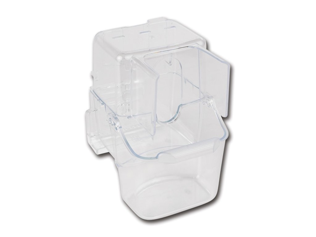 Krmítko se umisťuje na dvířka klece otevíratelné vodorovně!