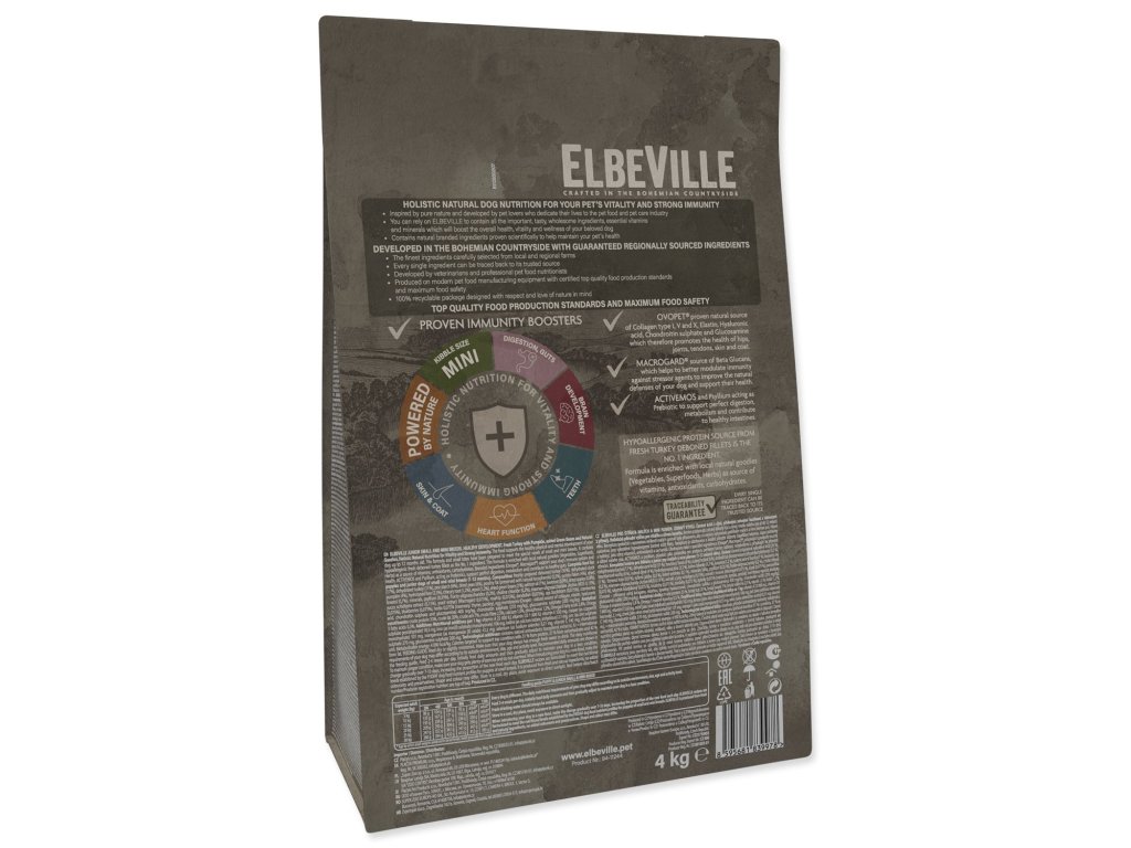 Krmivo bylo vyvinuto v souladu s holistickým, 360° pohledem na každodenní potřeby psa tak, aby zajistilo jeho vitalitu, imunitu a zdravé prospívání. Dbáme i na zdraví naší planety. Krmivo ELBEVILLE je vyráběno v České republice z lokálních surovin. Obaly krmiv ELBEVILLE jsou plně recyklovatelné.