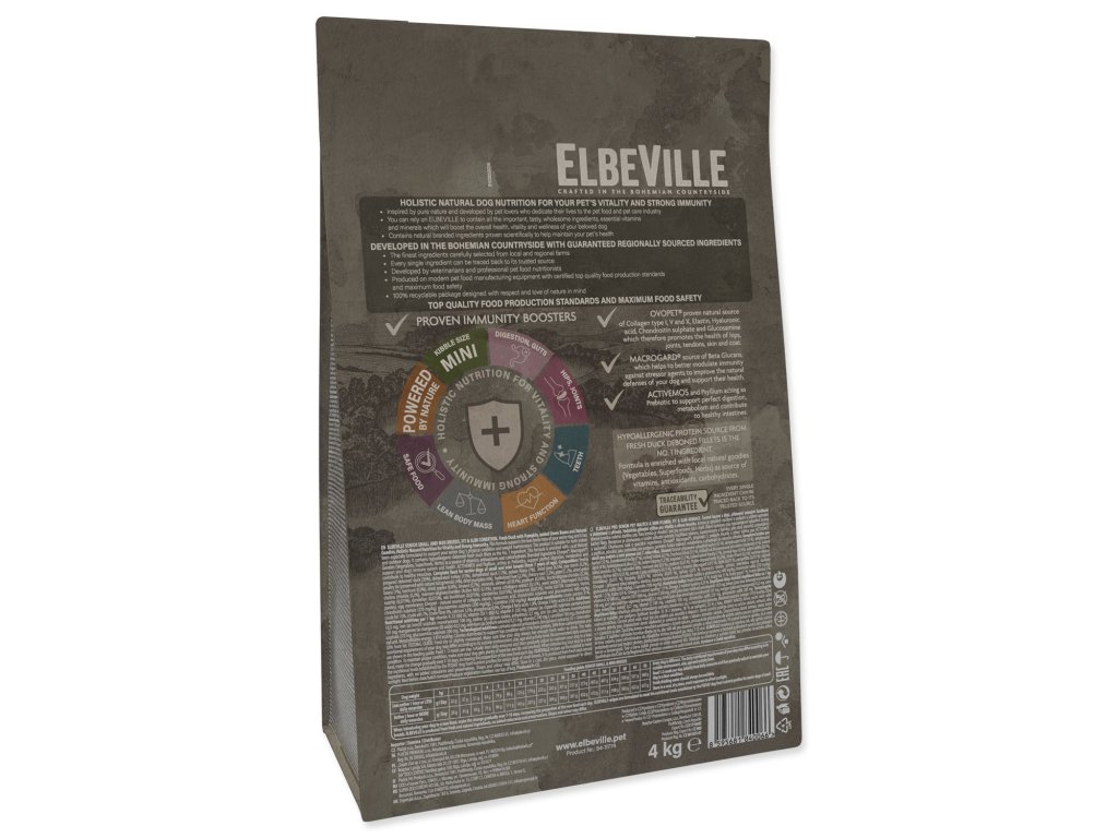Krmivo bylo vyvinuto v souladu s holistickým, 360° pohledem na každodenní potřeby psa tak, aby zajistilo jeho vitalitu, imunitu a zdravé prospívání. Dbáme i na zdraví naší planety. Krmivo ELBEVILLE je vyráběno v České republice z lokálních surovin. Obaly krmiv ELBEVILLE jsou plně recyklovatelné.
