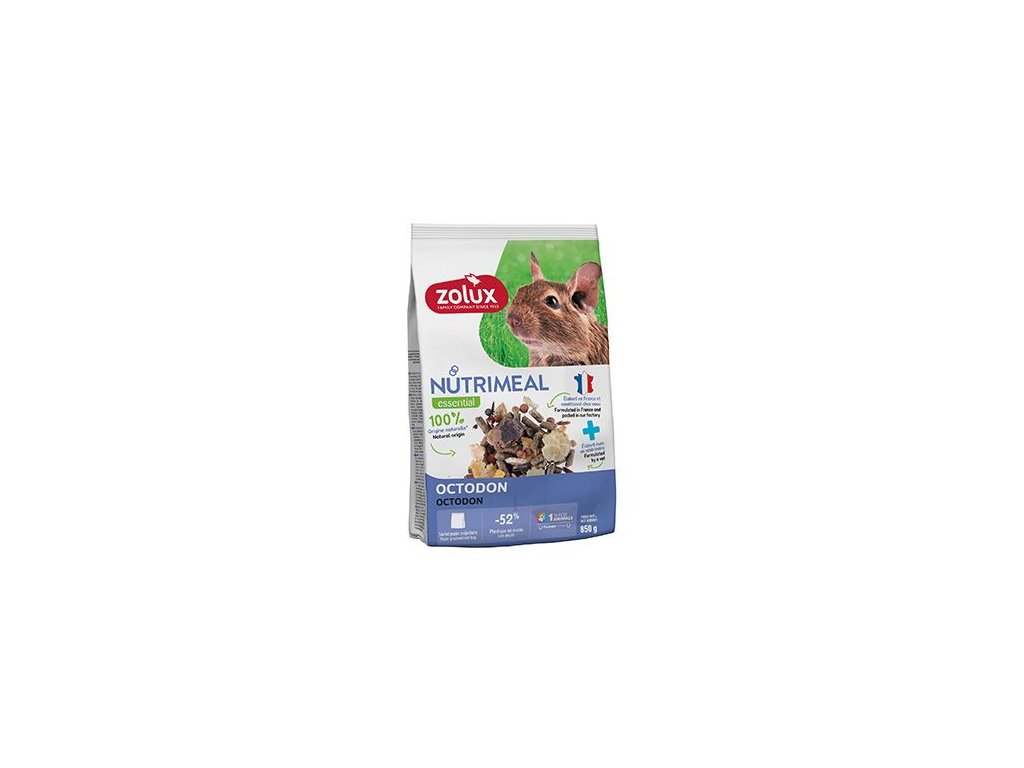 Kompletní směs krmiva pro osmáky, vyvinutá ve spolupráci s veterinárním lékařem tak, aby vyhovovala jejich specifickým nutričním potřebám. Krmivo je založeno výhradně na přírodních složkách, které poskytuje osmákům vše potřebné pro jejich zdraví, energii a pohodu.Přírodní složky: Krmivo se skládá ze 100% přírodních surovin, podporující vyváženou stravu přizpůsobenou potřebám osmáků.Francouzská kvalita: Vyrobeno a baleno ve Francii, splňuje evropské standardy kvality a zajišťuje vysoké standardy bezpečnosti a čerstvosti.Ekologické a praktické balení: Nové balení bylo navrženo s menším množstvím plastu a je odolnější vůči vlhkosti, což pomáhá udržet potraviny déle čerstvé.Společenská odpovědnost: Produkt s označením 1 % pro zvířata. Směs ZOLUX NUTRIMEAL pro osmáky je ideální krmivo pro majitele, kteří se starají o přirozenou a kompletní výživu svého mazlíčka, zajišťující osmákům zdravý vývoj a denní energii.Granule: Zamezují přebírání a podporují vyváženou stravu.Rozmanité složení: Zabraňuje rozvoji cukrovky. Složení: Granule 60%, čočka, hrachové vločky, ovesné vločky, kukuřičné vločky, pšeničné vločky, karob.Analytické složení: Celulóza 12,50%, protein 14,90%, tuky 3,00%, hrubý popel 4,60%, vápník 0,47%, fosfor 0,38%, sodík 0,16%. Rozměry: 145 x 90 x 230 mm