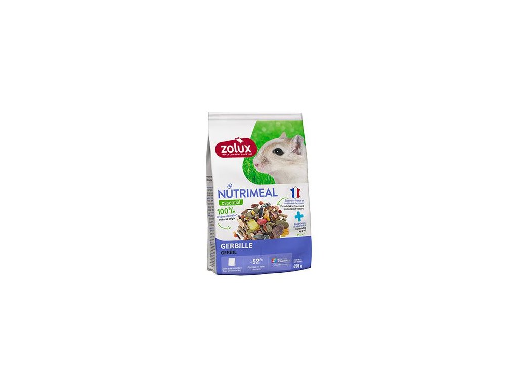 Kompletní směs krmiva pro pískomily, vyvinutá ve spolupráci s veterinárním lékařem tak, aby vyhovovala jejich specifickým nutričním potřebám. Krmivo je založeno výhradně na přírodních složkách, které poskytuje pískomilům vše potřebné pro jejich zdraví, energii a pohodu.Přírodní složky: Krmivo se skládá ze 100% přírodních surovin, podporující vyváženou stravu přizpůsobenou potřebám pískomilů.Francouzská kvalita: Vyrobeno a baleno ve Francii, splňuje evropské standardy kvality a zajišťuje vysoké standardy bezpečnosti a čerstvosti.Ekologické a praktické balení: Nové balení bylo navrženo s menším množstvím plastu a je odolnější vůči vlhkosti, což pomáhá udržet potraviny déle čerstvé.Společenská odpovědnost: Produkt s označením 1 % pro zvířata. Směs ZOLUX NUTRIMEAL pro pískomily je ideální krmivo pro majitele, kteří se starají o přirozenou a kompletní výživu svého mazlíčka, zajišťující pískomilům zdravý vývoj a denní energii.Vybrané, přizpůsobené: Nedráždí torby.Poměr složení tuků přizpůsobený (slunečnice): Potřebuje víc tuků než býložravec.Hrách a čočka: Zdroj bílkovin rostlinného původu. Složení: Granule 25%, hrachové vločky, slunečnice, karob, čočka, ovesné vločky, kukuřičné vločky, extrudát, pšeničné vločky, vyloupané arašídy.Analytické složení: Celulóza 9,30%, protein 16,10%, tuky 7,70%, hrubý popel 3,90%, vápník 0,45%, fosfor 0,42%, sodík 0,06%. Rozměry: 145 x 90 x 230 mm