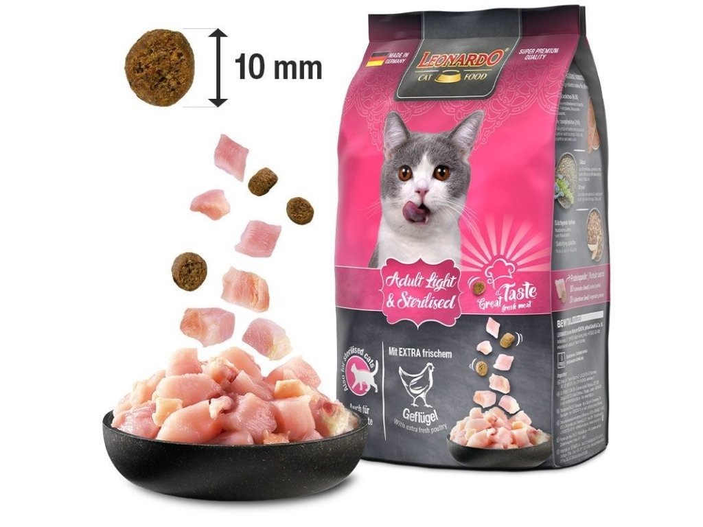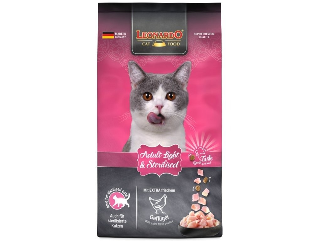 Chcete vyhrát boj s nadváhou vaší kočky? Vy, vaše šelma a špičkové dietní granule Leonardo to společně zvládnete Lehčí život bez tukuTuk usazený v cévách a na srdci může zkrátit život vaší kočky až o tři roky. Výlisky z jablek vypěstovaných na Evropském slunci zrychlují metabolismus a zabrání tak v usazování přebytečného tuku. Vaše kočičí láska tak bude účinně hubnout a její zdravé srdce bude bít jako zvon. Svaly jako z betonuŠťavnaté drůbeží maso a drůběží jatýrka jsou parádní dávka bílkovin. Svaly vaší kočky budou růst, ale její tělo nebude zatěžovat zbytečný tuk. Vítěz nad kažou nemocíMá vaše kočka na gauči své místo? Nebo už celý gauč patří jí? Čistě přírodní pivovarské kvasnice pomáhají tvořit imunitu jak u kočičích dobrodruhů, tak u koček, které mají rády svůj klid a přírodu pozorují jen z okna.