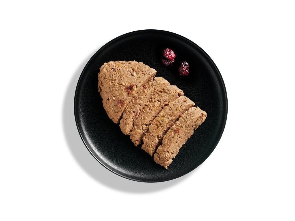 drůbeží srdce, játra, žaludek (37 %); maso z bažanta (30 %); masový vývar (29,8 %); brusinky (2 %); sušené vaječné skořápky (0,5 %); minerály (0,5 %); lososový olej (0,2 %).