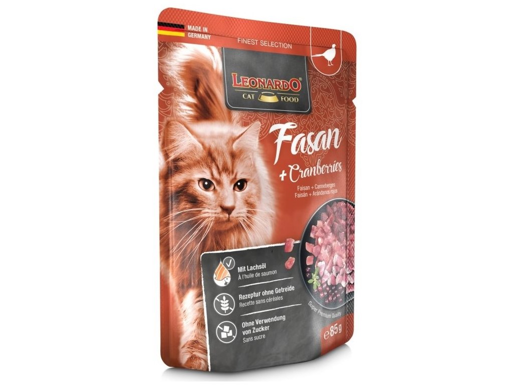 Kapsičky řady Leonardo “Finest Selection“ jsou dostupné v různých speciálně sestavených lahodných recepturách. Vysoce kvalitní kapsičky obsahují šetrně vařené šťavnaté maso, jsou vylepšené o pečlivě vybrané suroviny potravinářské kvality. Lososový olej poskytuje hodnotné Omega 3 nenasycené mastné kyseliny.