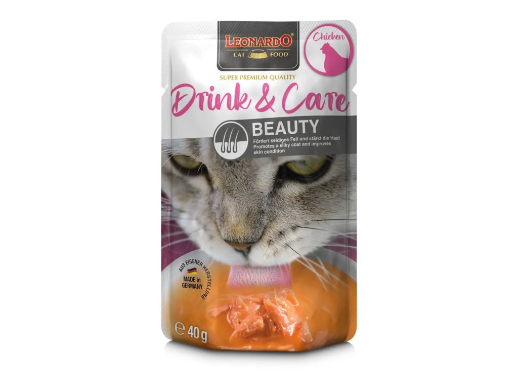 Chuť, která je vidět:To, že LEONARDO Drink & Care Beauty chutná vaší kočičce, vám ráda ukáže – a dá i pocítit. Například krásně hebkou a lesklou srstí, za kterou vděčí vysoce dostupným omega-3 mastným kyselinám z krilového oleje! Tento chutný drink se šťavnatými kuřecími kousky ve voňavém kuřecím vývaru zároveň podporuje příjem tekutin – ideální jako doplněk ke granulím.