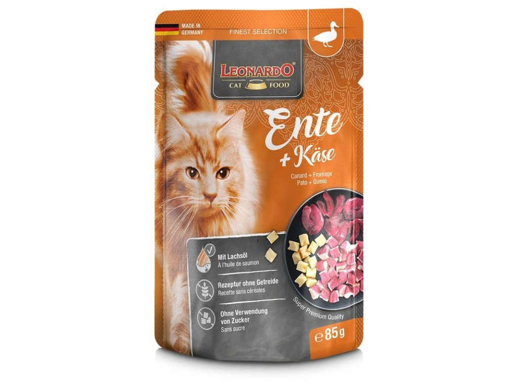 Kapsičky řady Leonardo “Finest Selection“ jsou dostupné v různých speciálně sestavených lahodných recepturách. Vysoce kvalitní kapsičky obsahují šetrně vařené šťavnaté maso, jsou vylepšené o pečlivě vybrané suroviny potravinářské kvality. Lososový olej poskytuje hodnotné Omega 3 nenasycené mastné kyseliny.
