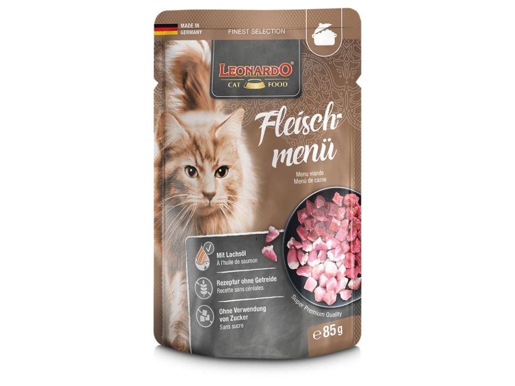 Kapsičky řady Leonardo “Finest Selection“ jsou dostupné v různých speciálně sestavených lahodných recepturách. Vysoce kvalitní kapsičky obsahují šetrně vařené šťavnaté maso, jsou vylepšené o pečlivě vybrané suroviny potravinářské kvality. Lososový olej poskytuje hodnotné Omega 3 nenasycené mastné kyseliny.